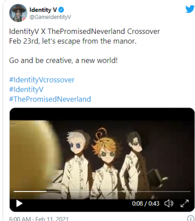 კროსოვერის პერიოდში თქვენთვისაც შეიძლება აიღოთ რამოდენიმე სკინი ან გმირი საჩუქრის სახით ,დაპირებული Neverland- ის ემა, ნორმანდი, რეი და იზაბელა მალე წარმოადგენენ თავიანთ დიდ დებიუტს Identity V სამყაროში, როგორც შეგროვილი კოსტიუმები არსებული გმირებისთვის.